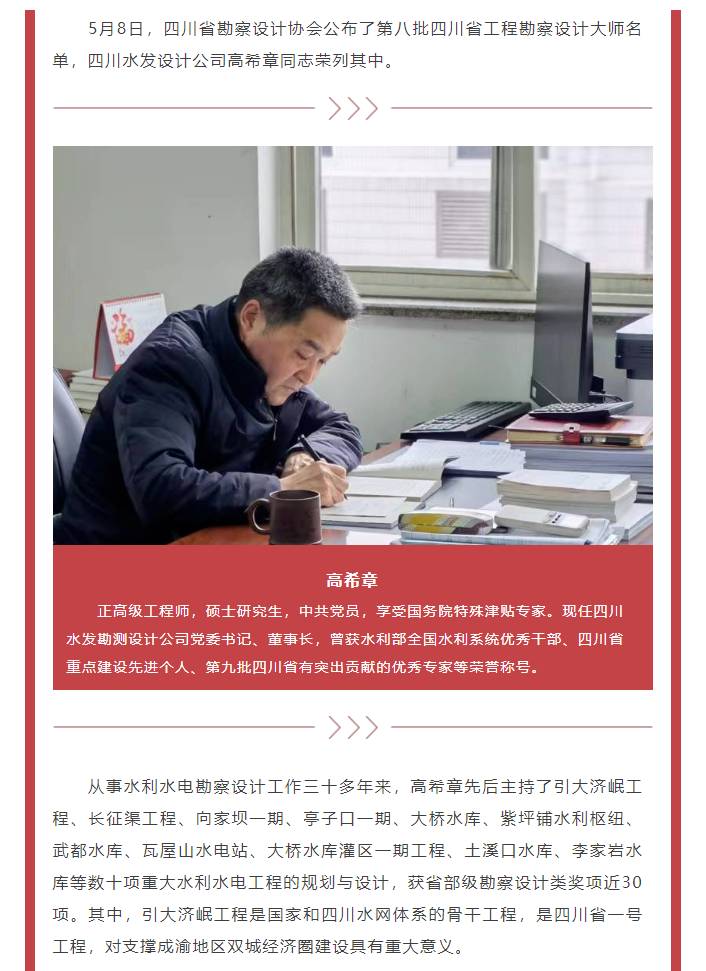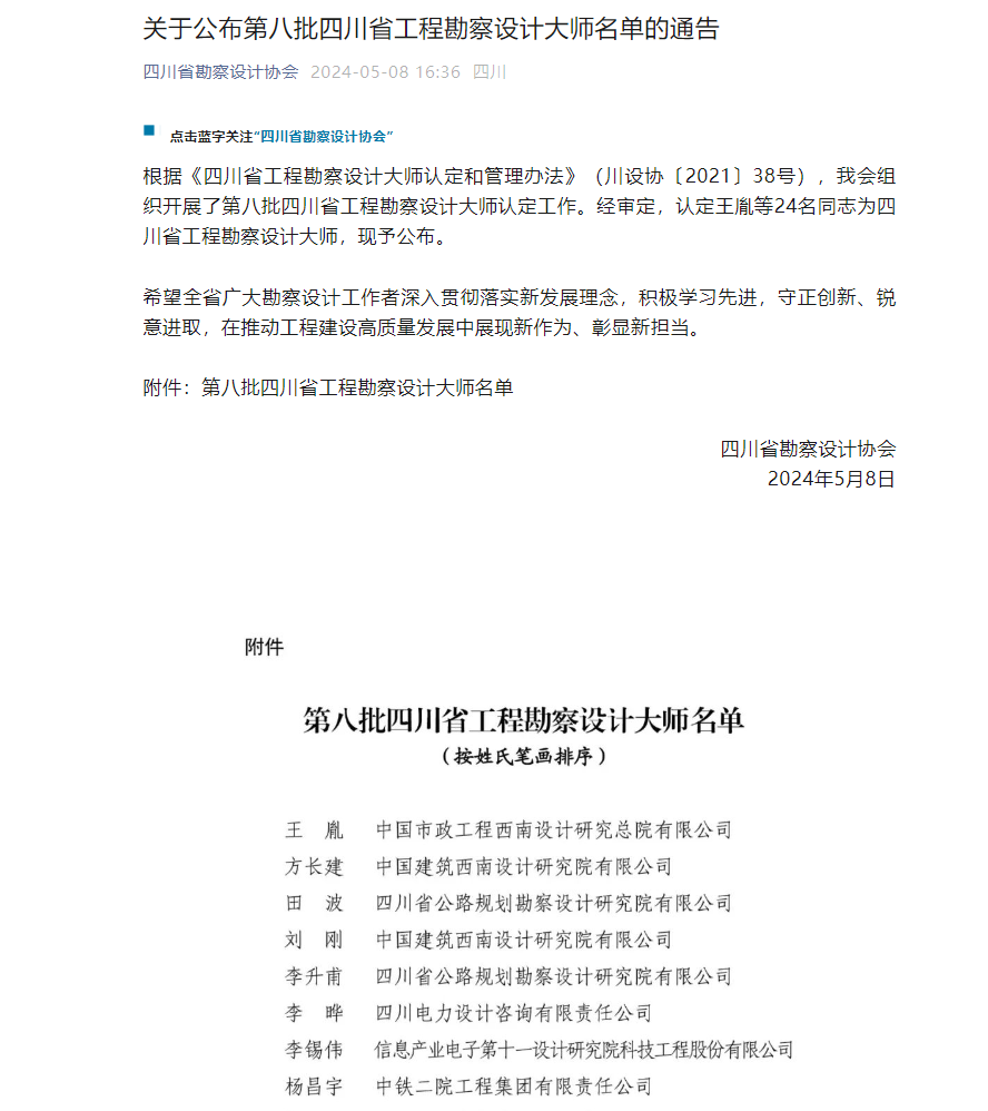 喜報!設計公司高希章同志榮獲“四川省工程勘察設計大師”稱號