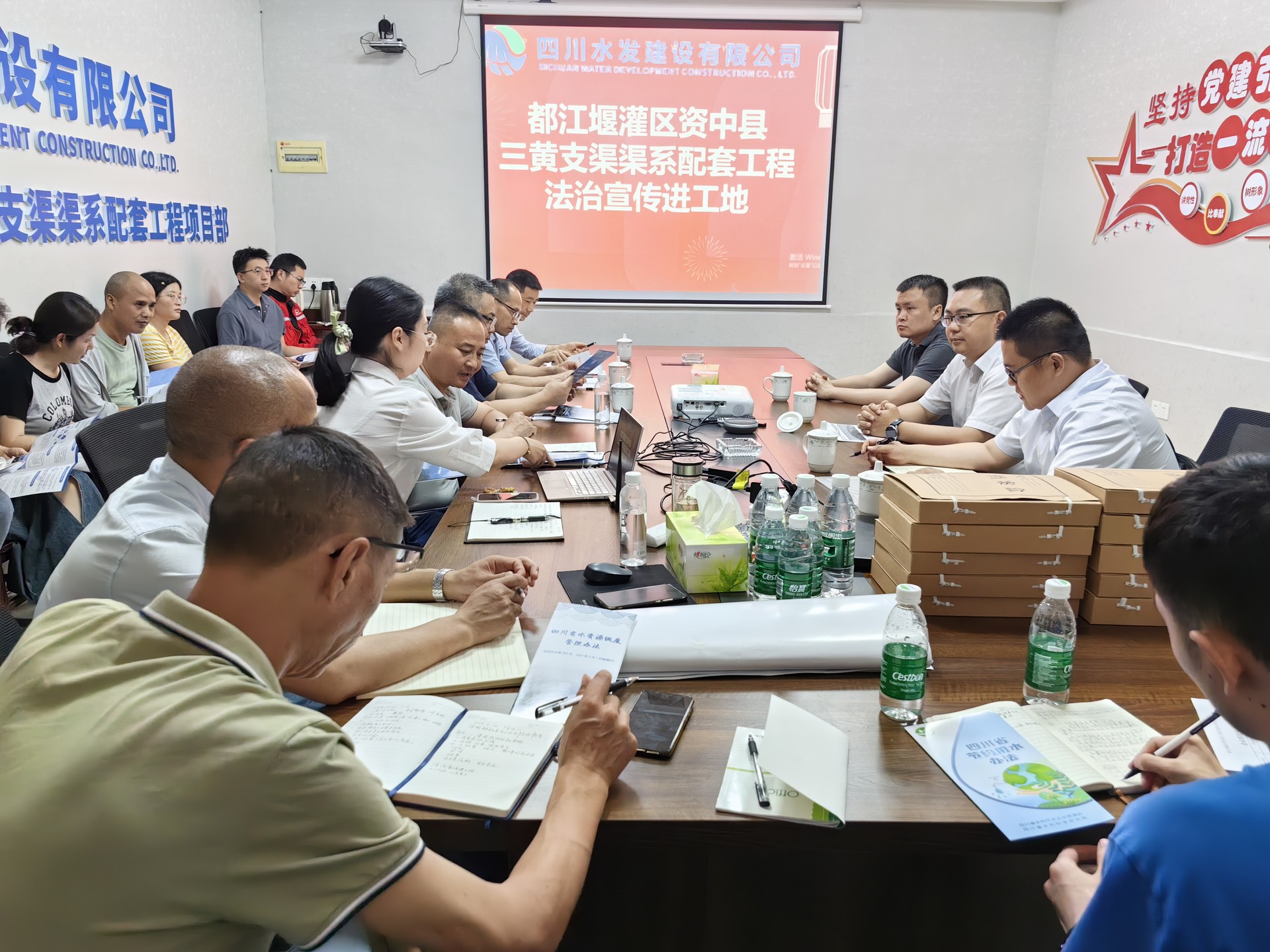 為進一步增強建筑企業和一線施工人員的法治意識和法治觀念,5月14日,集團副總經理鄭祖杰帶隊到建設公司都江堰灌區資中縣三黃支渠開展“法治宣傳進工地”普法宣傳活動并主持召開座談會,建設公司董事、總經理羅雪、集團審計法務部負責人等出席會議。
