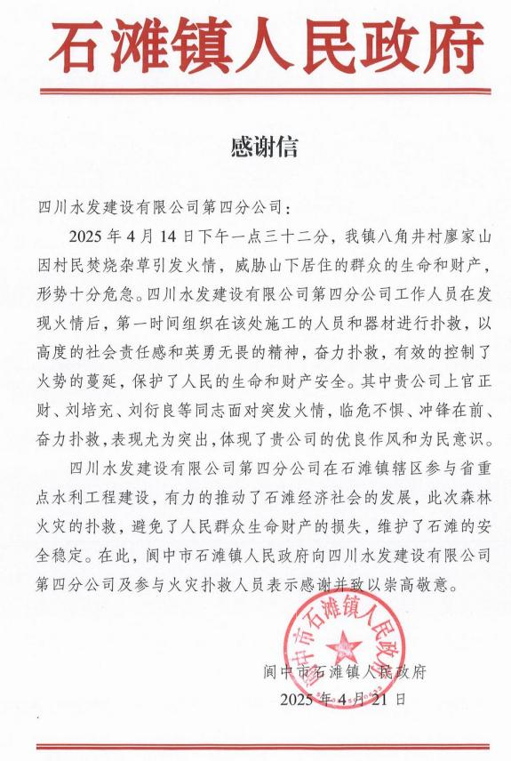 前不久,閬中市石灘鎮八角井村廖家山因村民焚燒雜草突發火情,火勢兇猛,迅速向民宅蔓延,情況萬分危急。建設公司四分公司青年突擊隊聞令而動,化身逆火而行的“鋼鐵戰士”,攜帶滅火器材奔赴火場。面對熊熊烈火,他們無畏無懼,手持鐵鍬、鋼鏟奮力清理可燃物,于上風口處奮勇撲打明火;針對火勢較大區域,熟練使用滅火器進行重點攻堅,并安排專人嚴密巡查,杜絕復燃隱患。在這場與時間賽跑、與烈火較量的戰斗中,青年突擊隊以專業的救援能力和頑強的拼搏精神,成功控制火情,為保障群眾生命財產安全筑起堅實防線,用實際行動詮釋了“水利鐵軍”不畏艱險、沖鋒在前的奉獻擔當,贏得了閬中市石灘鎮人民政府的高度贊譽與真摯感謝。